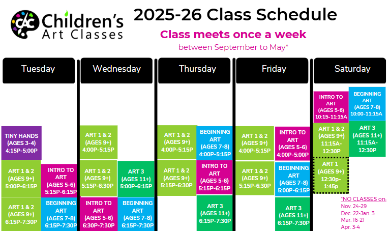 In the summer, we have Summer Workshops. These workshops are an a la carte of what our school year curriculum entails. At Children’s Art Classes, we strive to continue art education throughout the summer, nurture your child’s love of art, and of course, have FUN!
